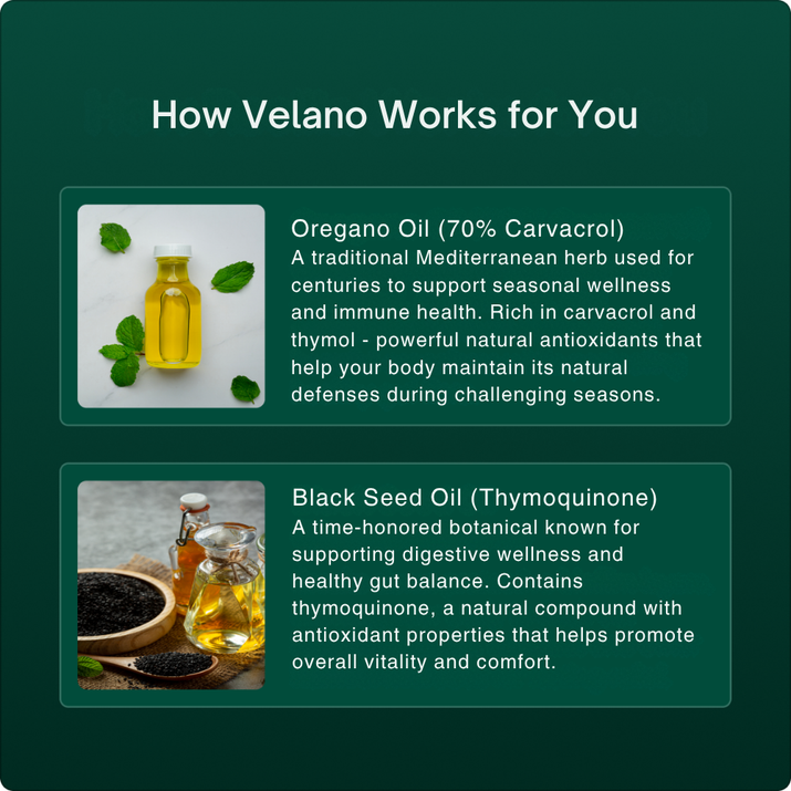 Answer 1: These softgels contain a potent 2-in-1 botanical blend with 80% carvacrol, which helps support your body's natural defenses, promotes respiratory health, and enhances daily vitality.
